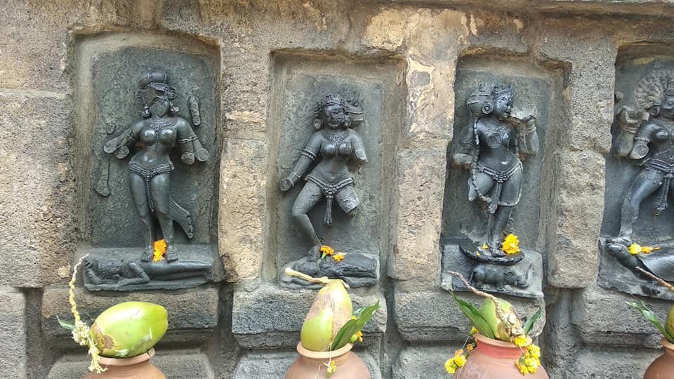 बाहरी प्रतिमाओं का आकार भीतरी प्रतिमाओं से अपेक्षाकृत किंचित विशाल है। कुछ मूर्तियाँ मृत देह पर खड़ी हैं तथा कुछ उन पशुओं पर खड़ी हैं जो साधारणतः मृत देह के समीप पाए जाते हैं, जैसे श्वान, सियार इत्यादि। आपको स्मरण होगा, कुछ तांत्रिक क्रियाओं में मृत देह का प्रयोग किया जाता है। सभी प्रतिमाओं ने हाथों में विभिन्न अस्त्र-शस्त्र धारण किए हैं।