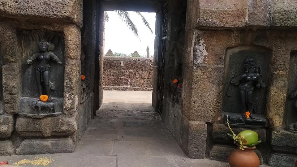 मंदिर का प्रवेश द्वार संकरा तथा कम ऊंचाई का है। आपको झुककर भीतर प्रवेश करना पड़ता है। वह भी एक समय केवल एक ही व्यक्ति प्रवेश कर सकता है। प्रवेशद्वार की बाहरी भित्तियों पर द्वारपाल जय एवं विजय उत्कीर्णित हैं। मंदिर की ओर जाते अत्यंत सँकरे गलियारे की भित्तियों पर काल एवं विकाल की छवियाँ उत्कीर्णित हैं। मंदिर के भीतर प्रवेश करते ही सँकरेपन का आभास लुप्त हो जाता है। कम ऊंचाई की गोलाकार भित्तियों के मध्य से खुला आकाश झाँकने लगता है। किन्तु यहाँ आपका ध्यान आकर्षित करती हैं मंदिर के आकार में निर्मित आलों की एक सुव्यवस्थित पंक्ति तथा इन आलों के भीतर स्थापित काले ग्रेनाइट में गढ़ी योगिनियों की प्रतिमाएं।